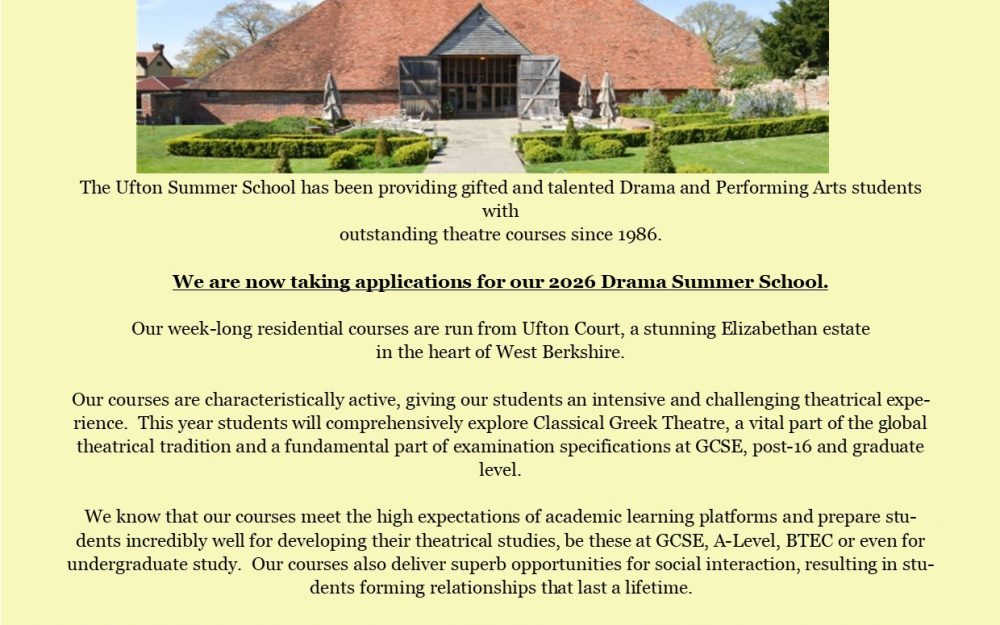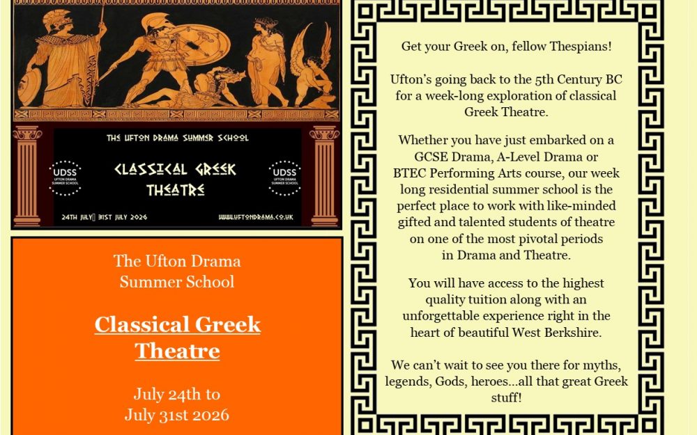 Applications for the Ufton Drama Summer School are generally made available from August the year before the start of the next course. We are now taking applications for 2026 Classical Greek Theatre.