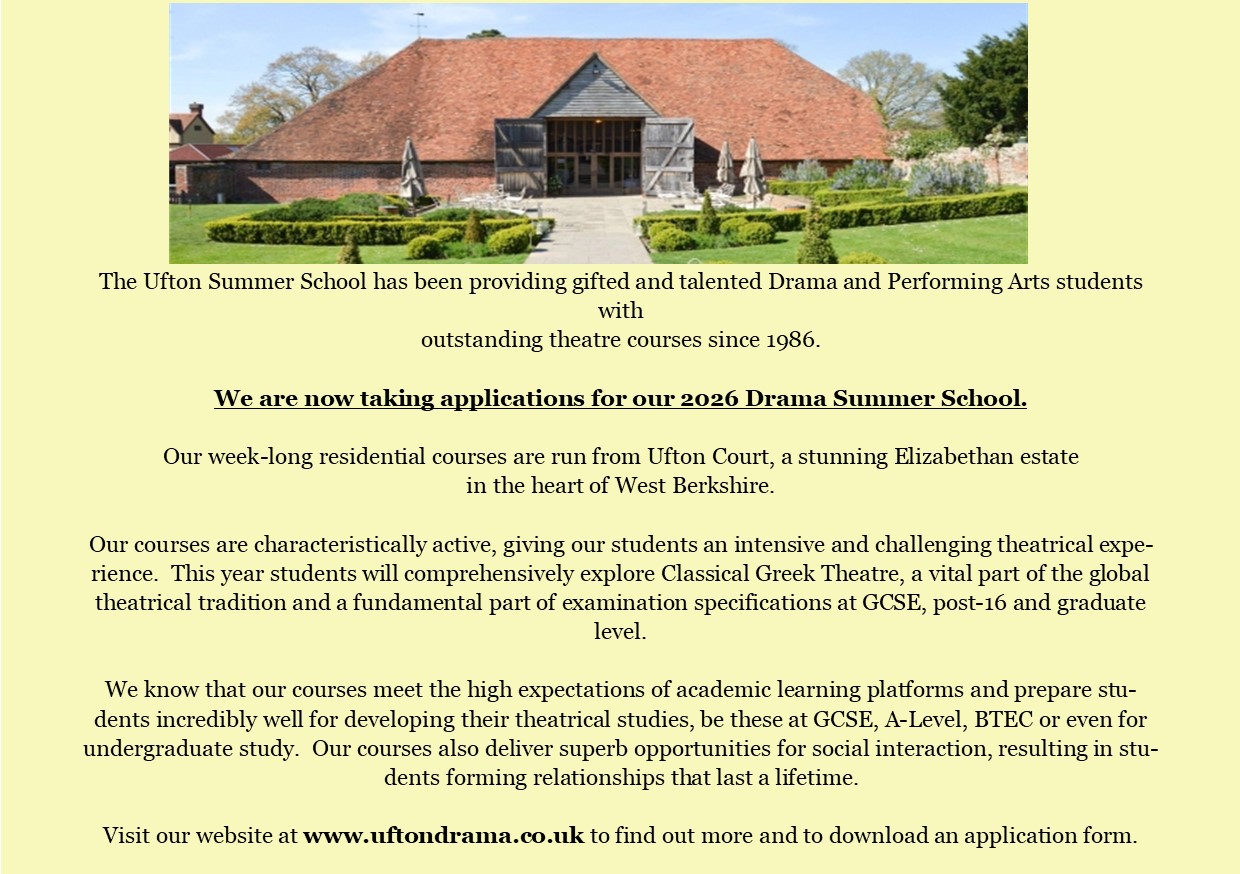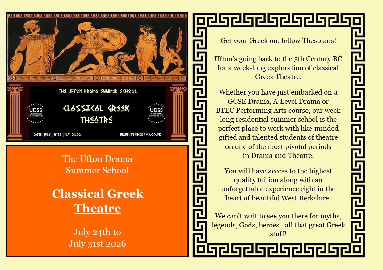 Applications for the Ufton Drama Summer School are generally made available from August the year before the start of the next course. We are now taking applications for 2026 Classical Greek Theatre.